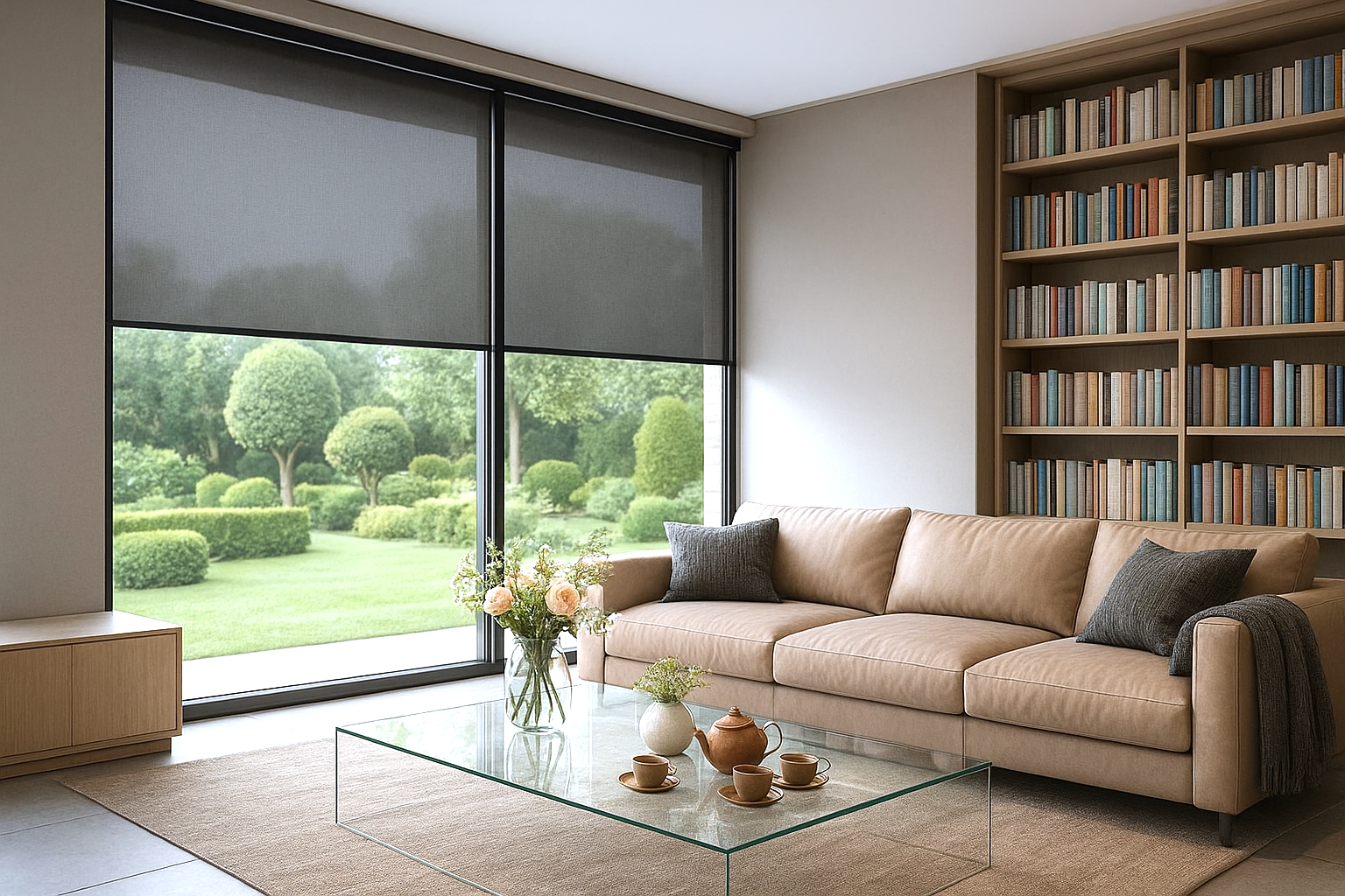 在這個客廳裡,霧灰色捲簾以極簡線條掌控光影,將自然以最靜謐的方式引入室內。落地窗之外,是綠意的深呼吸;窗飾之內,則是生活的高級質感。溫暖的材質、柔和的色調與精準的窗飾比例,共同構築出一種不需多語、卻能深刻感受的美。