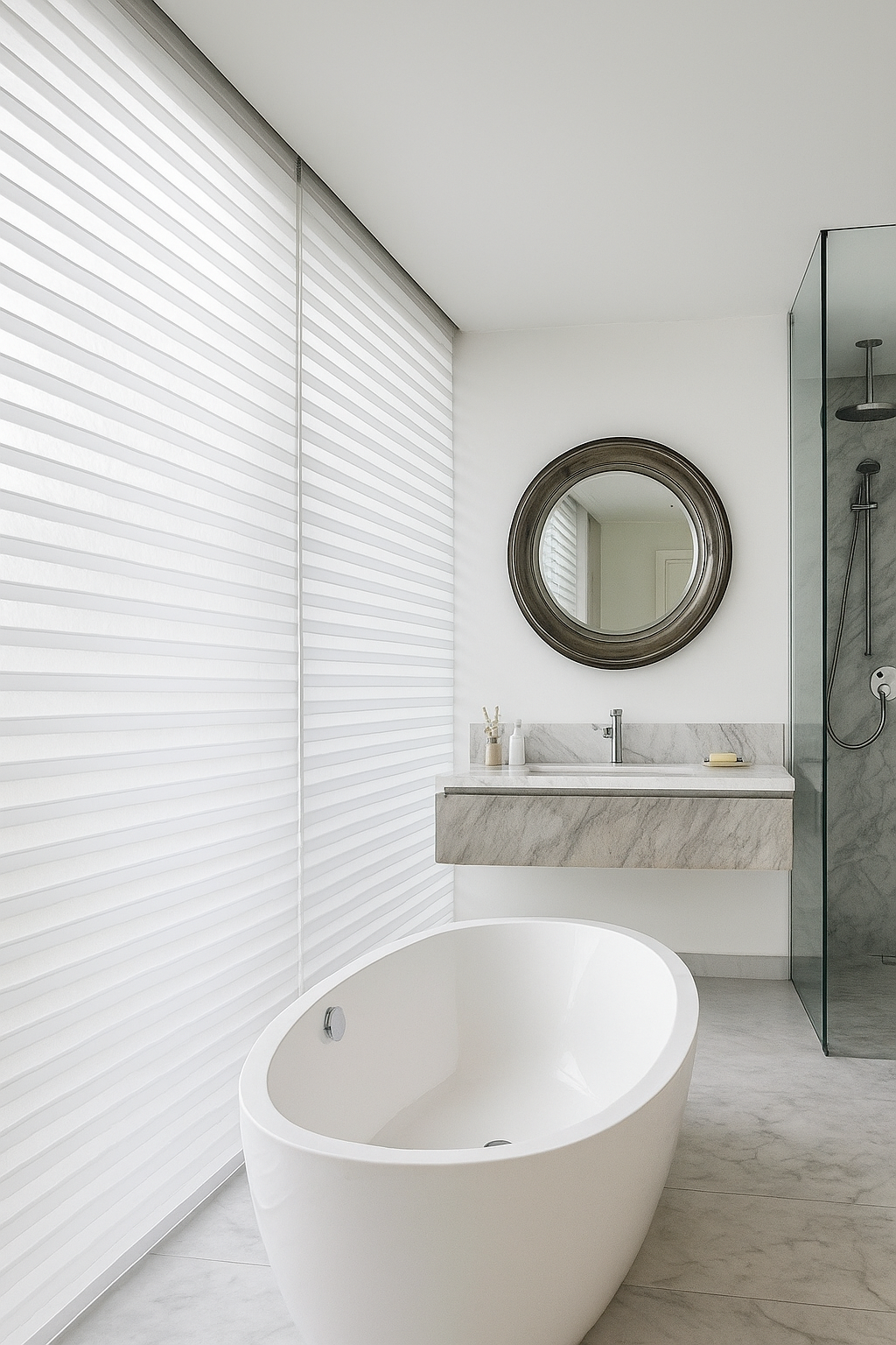 浴室的美,來自光線的雕刻。柔絲百葉以規律的節奏引導亮度,被過濾的白光在牆面與地面輕輕流動,勾勒出空間最純粹的線條。獨立浴缸像是一件置中的極簡雕塑,圓形鏡框則在視覺上形成柔與剛的對話。透明淋浴間讓空間維持完整性,使所有元素以最克制、乾淨的方式共存。這是一個在極簡中尋找溫度、在秩序中找到平靜的設計語彙。