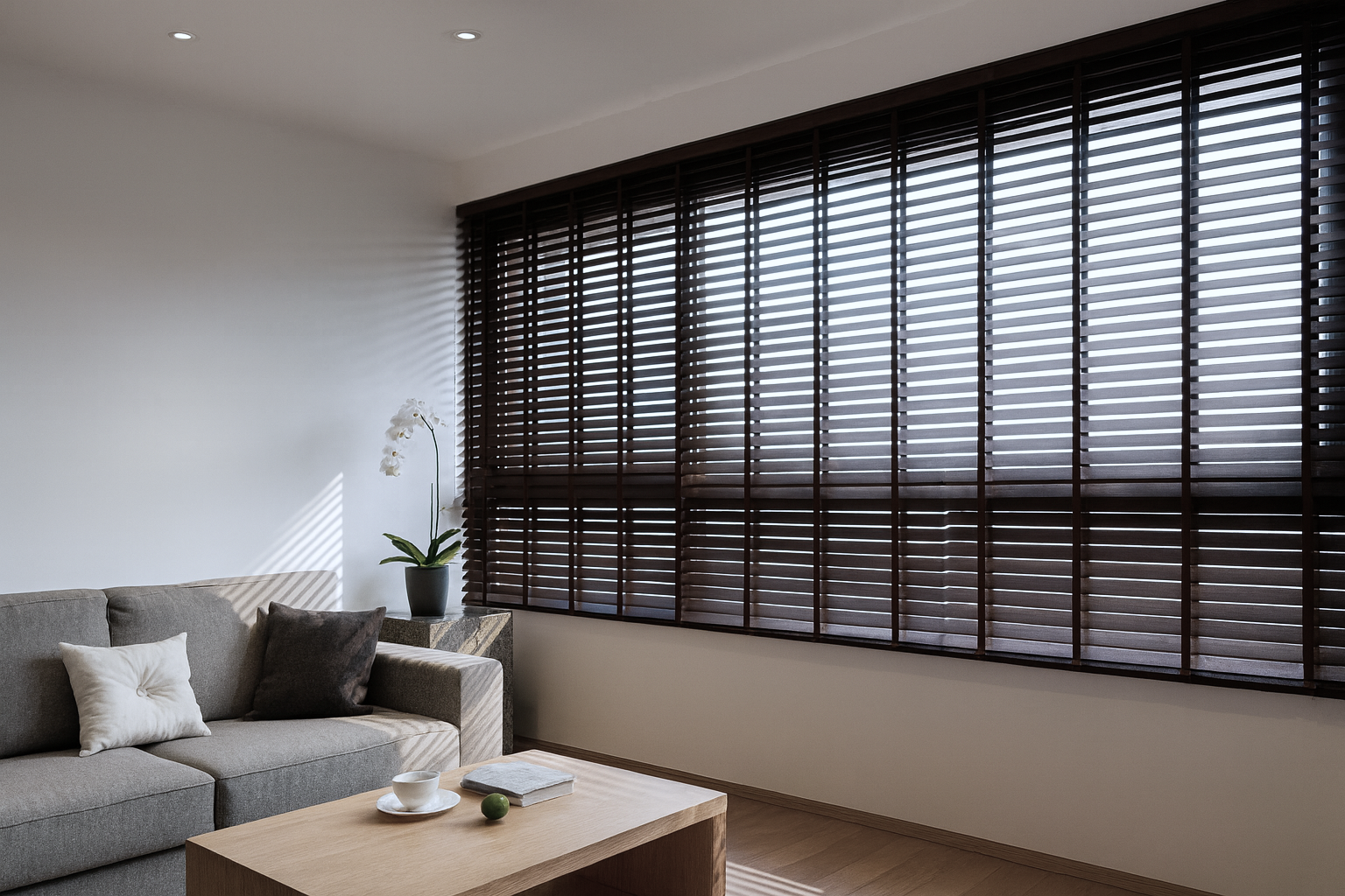 光影被木質溫度揉進生活裡的靜謐客廳。深色木百葉以俐落線條完整定義窗面,使光線被重新雕塑,轉化成空間最高級的風景。灰階沙發與原木茶几建立起沉穩的調性,而白蘭花則是一抹克制卻非常精準的點綴。在這樣的場域裡,材質、光影與比例構成了低調但堅定的品味宣言。