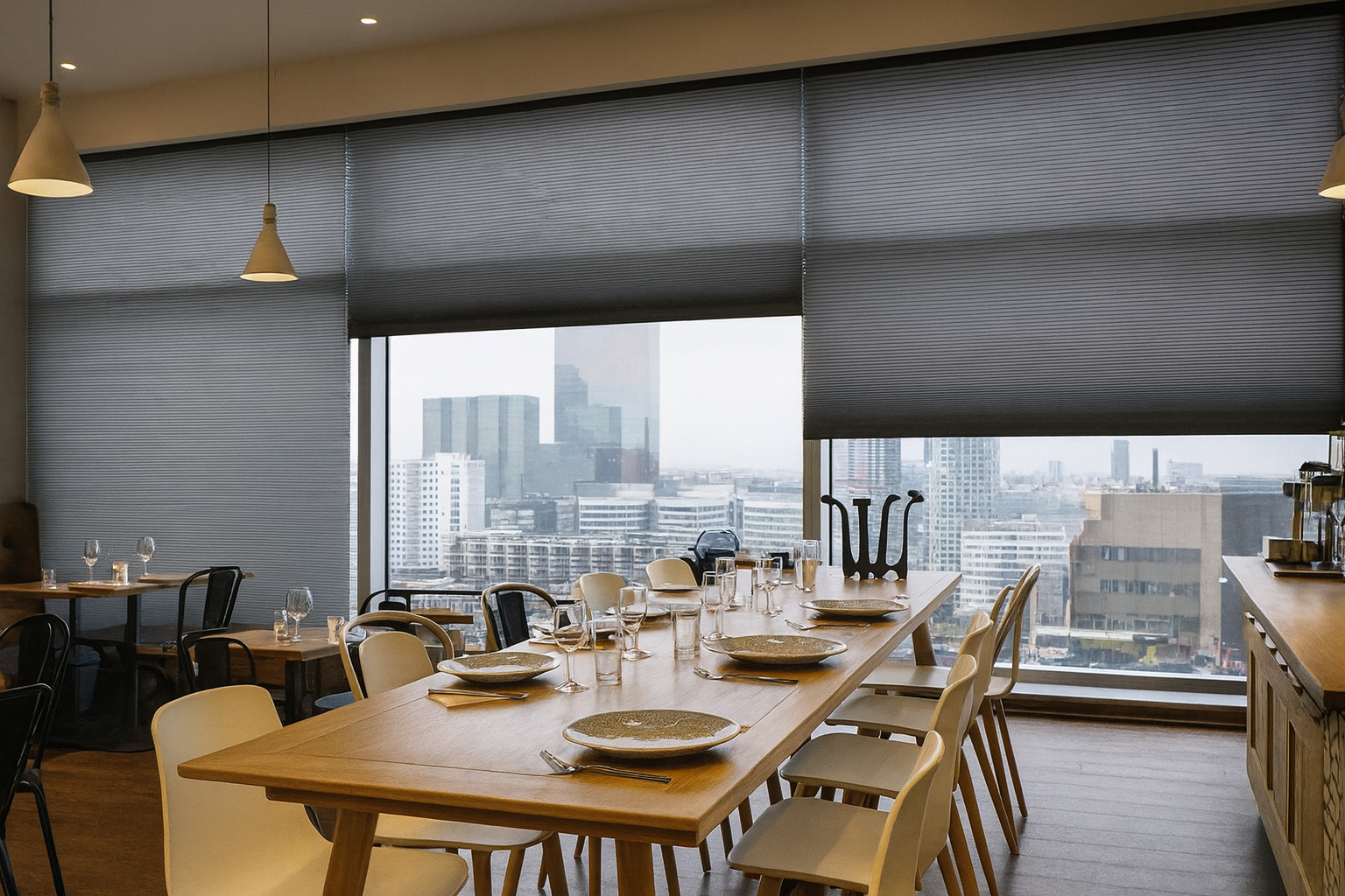 此空間以「光線調控」為核心策略,選用風琴簾作為主要窗飾,使外部景觀在視覺強度上被有效柔化,營造室內用餐區穩定而均衡的亮度。風琴簾的細緻紋理在大面積窗景中建立水平視覺節奏,與木質桌面及淺色家具相互呼應,強化空間的整體性。此配置成功在開放式視野與舒適的室內氛圍間取得平衡,使場域具備商用餐廳、接待空間與私人會談的多元可能性。